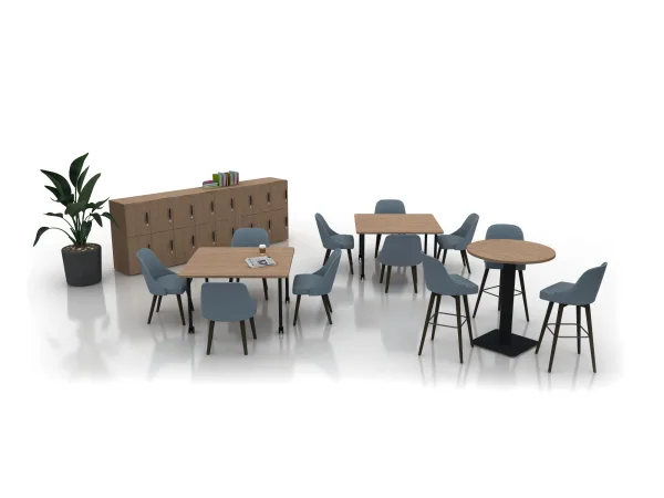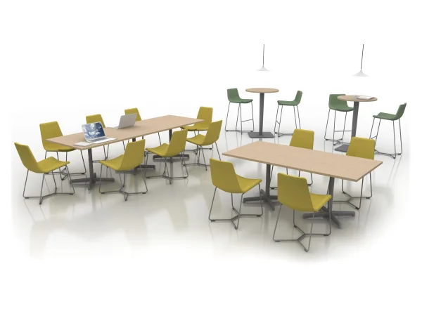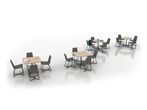 Cafe spaces accommodate both meal and break times as well as informal meetings over coffee and snacks. Primary to this application is furniture that offers a simple aesthetic and is easy to clean and rearrange.
