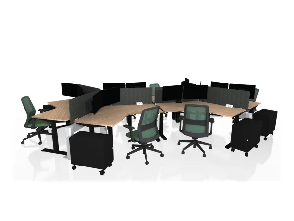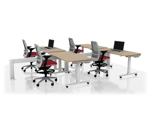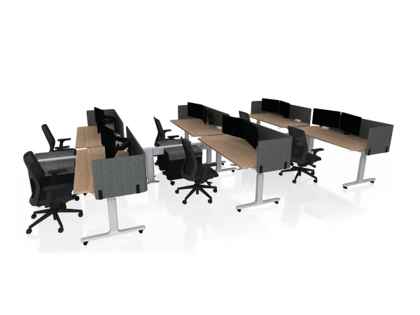 Open Plan Desking offers more flexibility than benching or panel-based workstations, with fewer fixed elements such as walls, systems, and central power channels. This application allows for 'unbounded’ layouts featuring height adjustable, freestanding desks that can be easily re-oriented as needed.